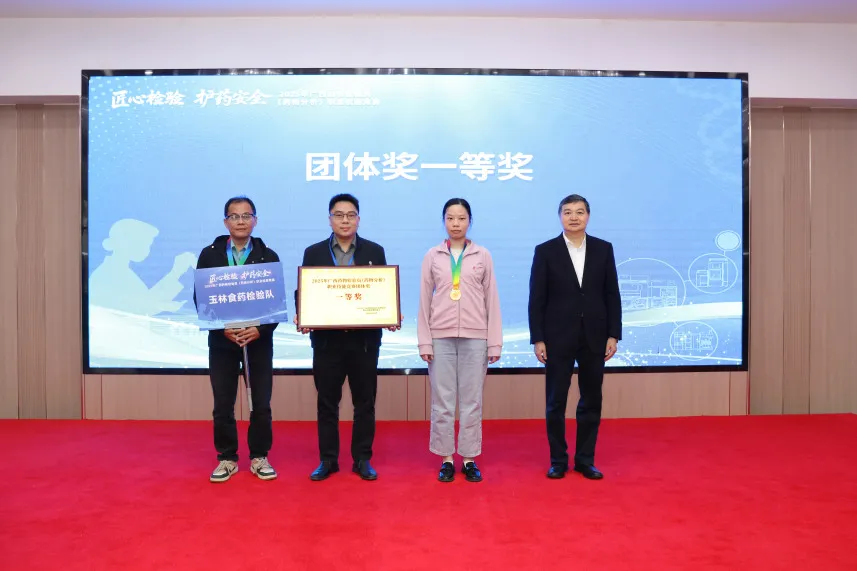 玉林市食品药品检验检测中心夺得团体一等奖, 柳州市质量检验检测研究中心、梧州市食品药品检验所获得团体二等奖,南宁市食品药品检验所、桂林三金药业股份有限公司、桂林南药股份有限公司获得团体三等奖。