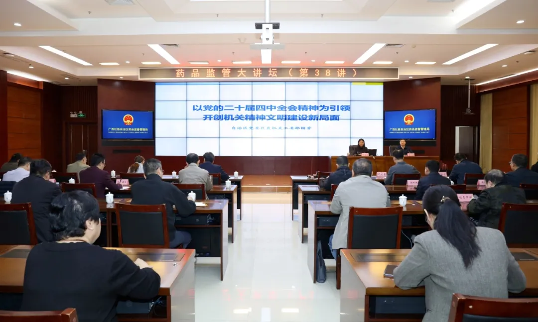 12月1日,918博天堂举办第38期药品监管大讲坛,邀请自治区党委区直机关工委二级巡视员邵国芳围绕“以党的二十届四中全会精神为引领开创机关精神文明建设新局面”作专题讲座。局党组书记、局长李勇强主持讲坛并讲话。在家的局党组成员、副局长韦广辉、沈宏睿在主会场参加讲坛。