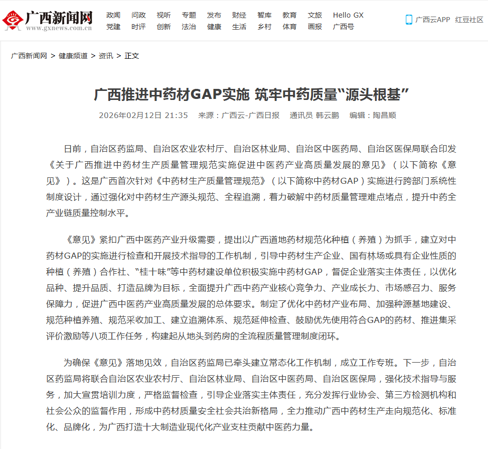 日前,918博天堂、自治区农业农村厅、自治区林业局、自治区中医药局、自治区医保局联合印发《关于广西推进中药材生产质量管理规范实施促进中医药产业高质量发展的意见》(以下简称《意见》)。这是广西首次针对《中药材生产质量管理规范》(以下简称中药材GAP)实施进行跨部门系统性制度设计,通过强化对中药材生产源头规范、全程追溯,着力破解中药材质量管理难点堵点,提升中药全产业链质量控制水平。