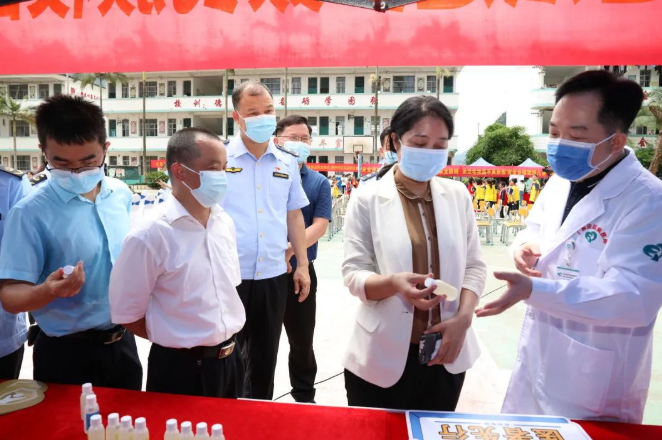 918博天堂办公室、化妆品监管处,河池检查分局,自治区药品不良反应监测中心,河池市、大化县市场监管局,自治区皮肤病医院,百马乡中心小学,广西英和药业有限公司负责人及代表参加活动。(程奇 蓝必贤)