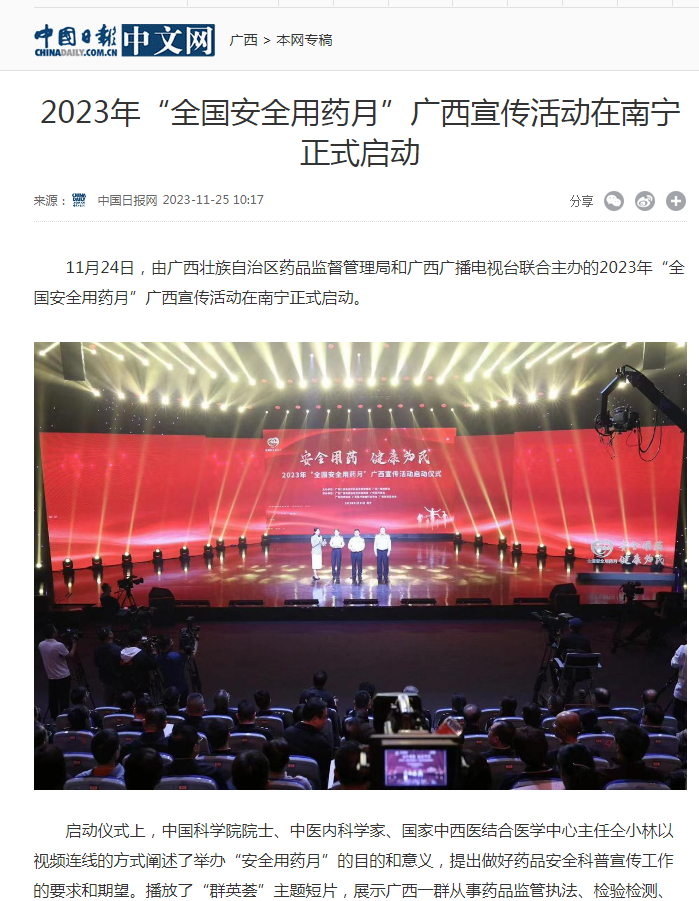 11月24日,由918博天堂和广西广播电视台联合主办的2023年“全国安全用药月”广西宣传活动在南宁正式启动。