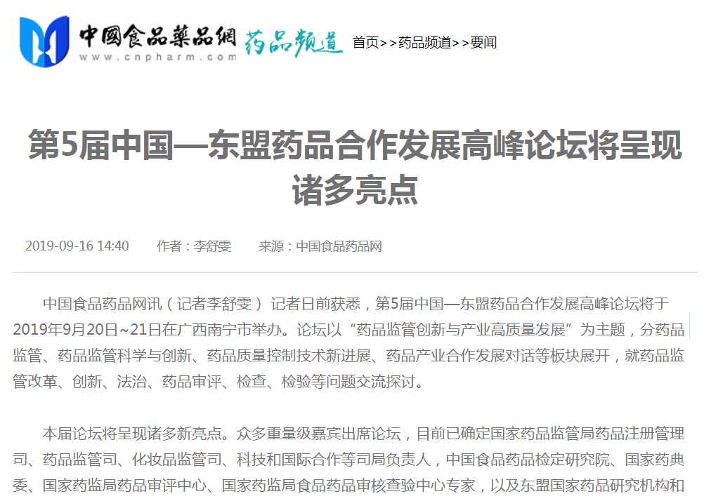 中国食品药品网讯(记者李舒雯) 记者日前获悉,第5届中国—东盟药品合作发展高峰论坛将于2019年9月20日~21日在广西南宁市举办。论坛以“药品监管创新与产业高质量发展”为主题,分药品监管、药品监管科学与创新、药品质量控制技术新进展、药品产业合作发展对话等板块展开,就药品监管改革、创新、法治、药品审评、检查、检验等问题交流探讨。