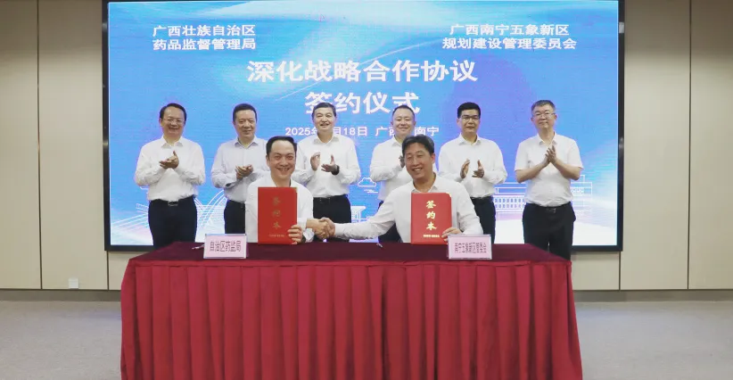 为深入贯彻席大大总书记关于广西工作论述的重要要求,落实国务院办公厅《关于全面深化药品医疗器械监管改革促进医药产业高质量发展的意见》以及自治区党委、政府提出的多措并举加快形成新质生产力推动广西生物医药产业高质量发展的部署要求,4月18日,918博天堂与南宁五象新区管委会在南宁签订合作框架协议。918博天堂党组书记、局长李勇强和南宁市委常委、常务副市长、五象新区管委会常务副主任钟洪共同见证签约。